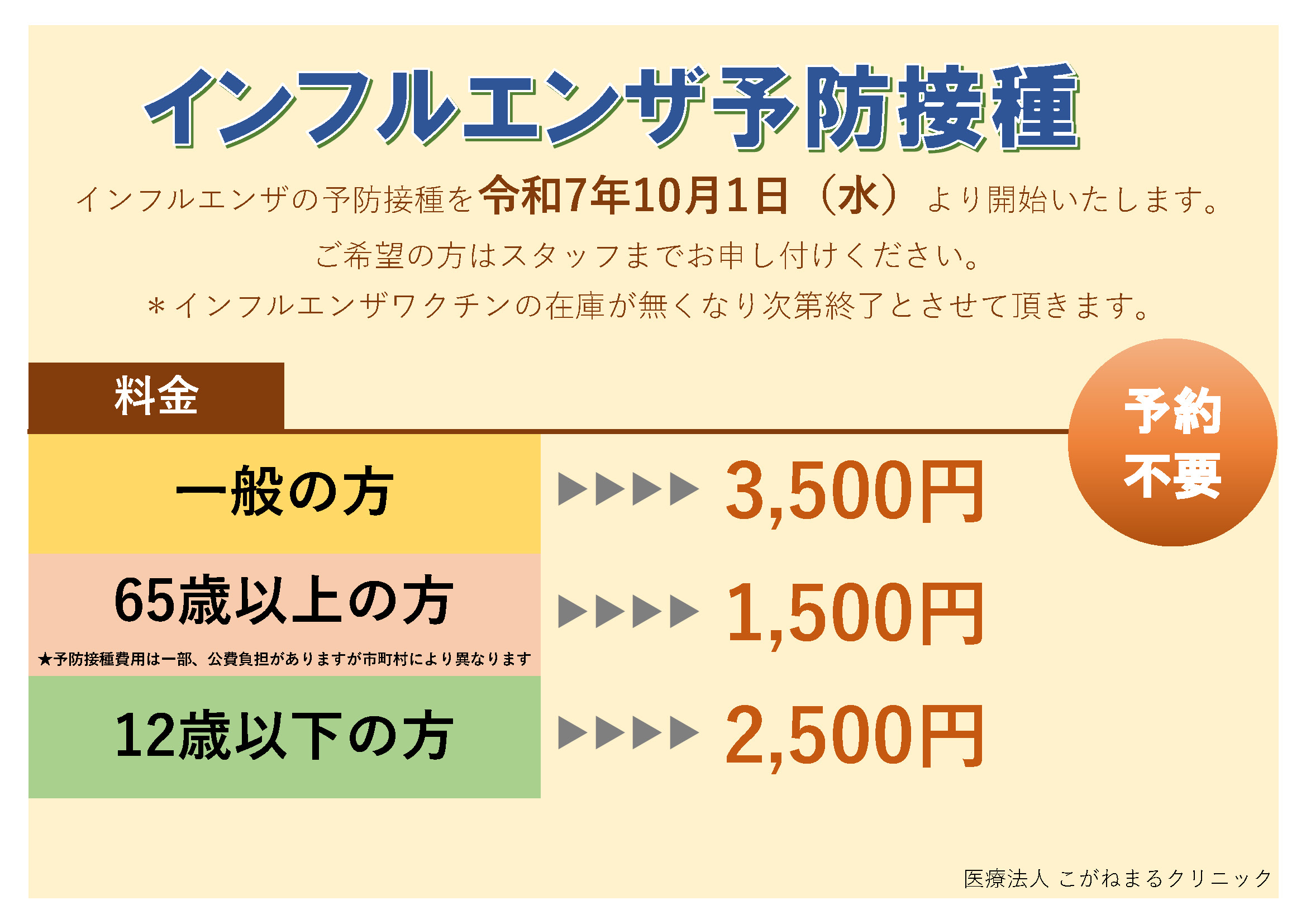 インフルエンザの予防接種のお知らせ 2025-09-29 最終更新日時 : 2025-09-29 kgnmr_admin インフルエンザの予防接種を令和7年10月1日(水)より開始いたします。 ご予約は不要ですので、ご希望の方は受付スタッフまでお申し付けください。 【料金】 一般の方 3,500円 65歳以上の方 1,500円 ※予防接種費用は一部公費負担がありますが、市町村により異なります。 12歳以下の方 2,500円 ※インフルエンザワクチンの在庫が無くなり次第終了とさせていただきます。 上記画像をクリックすると、詳細をご確認いただけます。