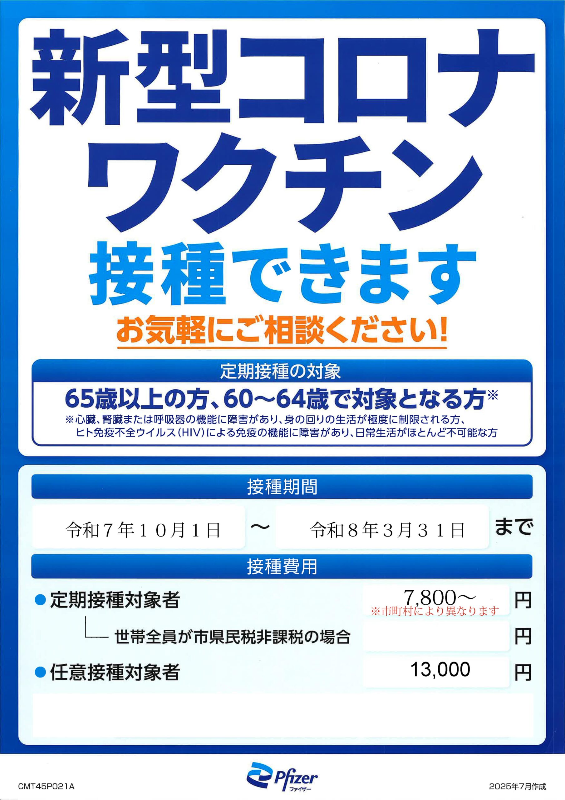 新型コロナウイルス感染症のワクチン接種を令和7年10月1日から令和8年3月31日までの期間に実施いたします。