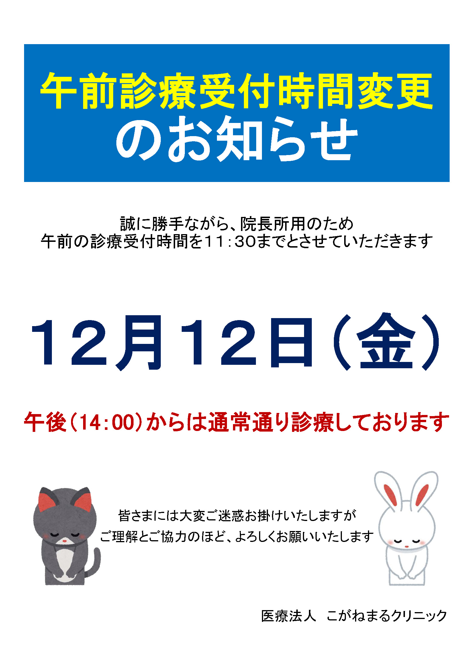 院長所用のため、誠に勝手ながら12月12日(金)午前の診療受付時間を11:30までとさせていただきます。